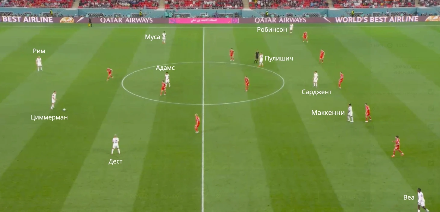 В первых таймах США прессинговали в стиле «Ливерпуля». В матче с Уэльсом нападающий Сарджент опускался к опорному полузащитнику соперника, эпизодически выдвигался на центрального защитника в тройке, а фланговые нападающие Пулишич и Веа разбирали крайних центральных защитников.