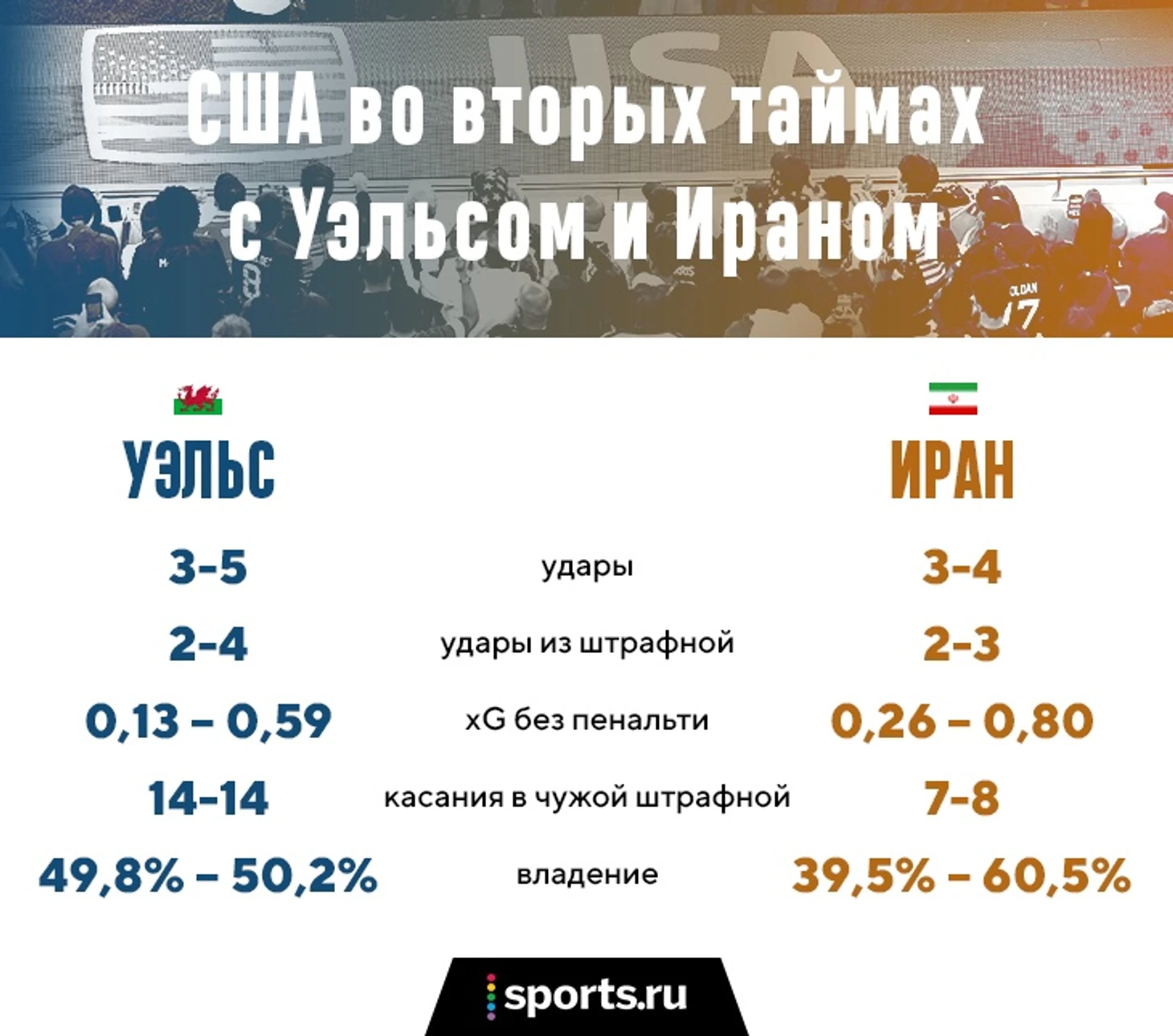 Несмотря на различия в построении атаки США, первые таймы с Уэльсом и Ираном были похожи: американцы редко создавали острые моменты. Показатель xG не должен смущать. Голы Веа и Пулишича весили по 0,41 xG: в игре с Уэльсом почти 2/3 от созданного до перерыва, против Ирана – почти половину.