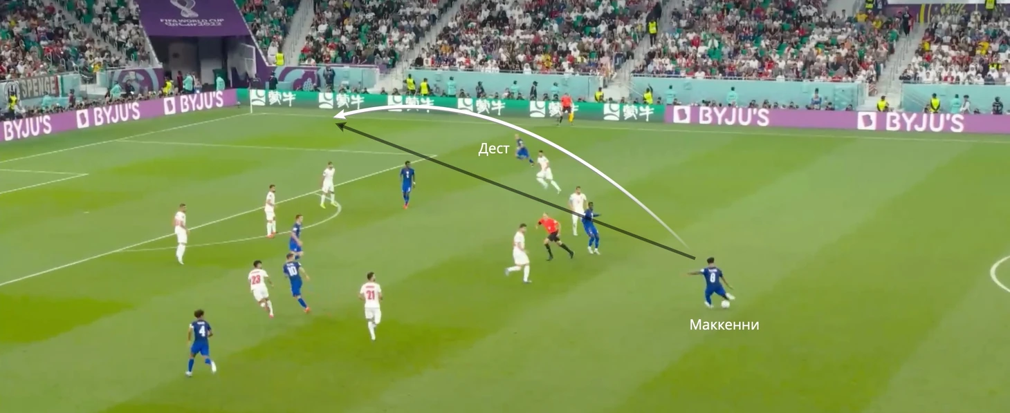 В матче с Уэльсом такая комбинация была почти невозможна: Маккенни действовал близко к правому краю, а Дест редко подключался к финальной фазе атаки и в чужой штрафной не касался мяча вообще. В первом тайме с Ираном все радикально изменилось: Маккенни стал самым креативным игроком, а Дест чаще всех касался мяча (наряду с Тайлером Адамсом). Одна потрясающая диагональ на Деста привела к голу Пулишича. Почти сразу после нее Маккенни вырезал длинную передачу на Сарджента – тот пробил мимо.