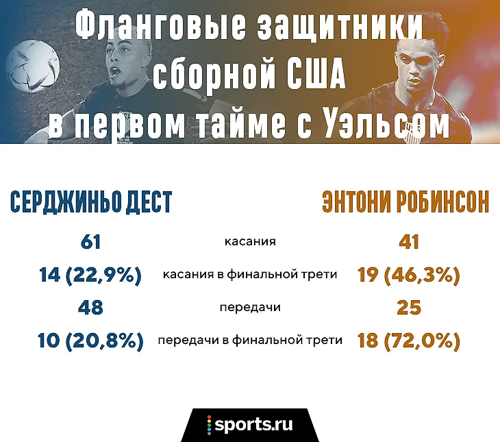 При этом забросы на правом краю почти ни к чему не приводили – в штрафную Уэльса мяч доходил через левый фланг Робинсона. Разницу в функциях Деста и Робинсона в игре с Уэльсом отлично показывает их пасовая статистика.