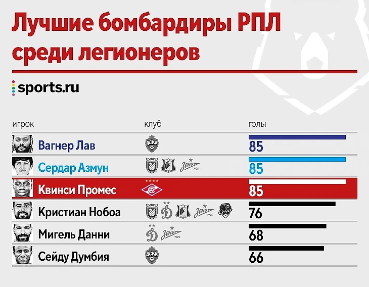 Квинси Промес спустя три недели вернулся на поле и принес победу «Спартаку» в сумасшедшем матче с «Краснодаром» (4:3). Промес забил 85-й гол в РПЛ и догнал Вагнера Лава и Сердара Азмуна. Теперь эта троица – лучшие бомбардиры-легионеры в истории лиги. Sports.ru представляет сравнительную инфографику о достижениях прекрасных бомбардиров.