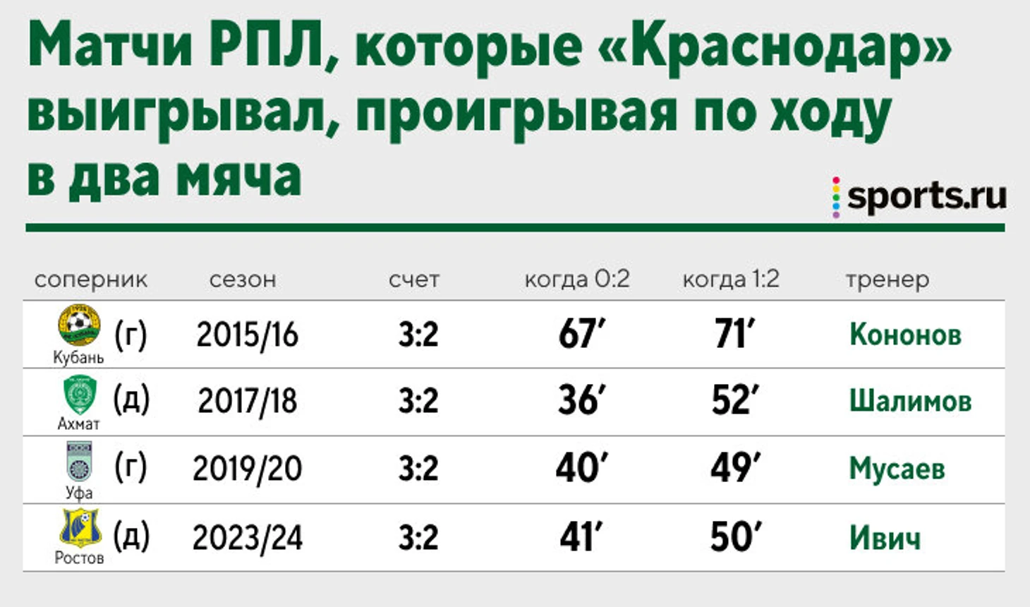 Это всего четвертая победа «Краснодара» после 0:2 по ходу игры. Теперь по одной такой победе – у каждого знакового тренера «Краснодара».