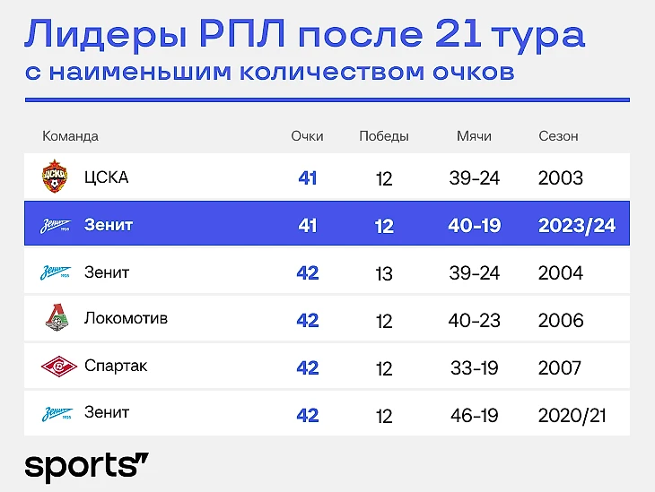 «Зенит» идет первым с 41 очком – это очень мало, еще никогда лидер после 21 тура не набирал меньше. Более того, почти все худшие результаты лидеров на этом отрезке случились еще в 2000-е. Мы забыли, что главный претендент на титул может быть настолько слаб.