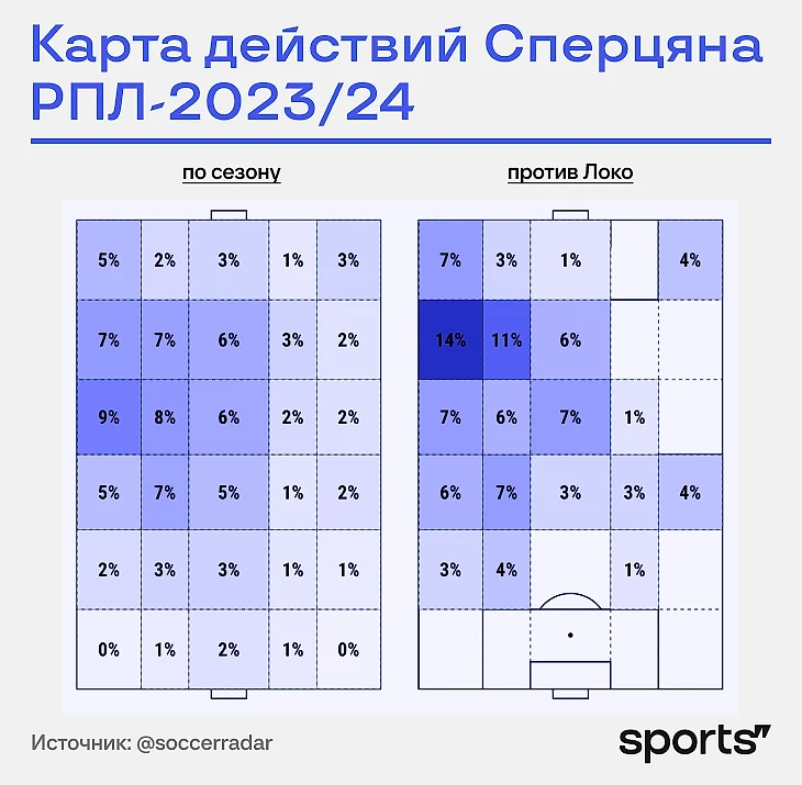 Против «Локо» Мусаев не отошел от пятерки защитников при обороне (левый фланг закрывал Жоау Баши), но выдвинул Сперцяна на позицию инсайда и попытался прессинговать выше.