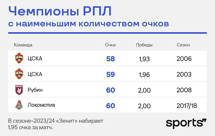 При сохранении нынешнего темпа набора очков (1,95 за матч) «Зенит» максимально приблизится к антирекорду чемпиона России (1,93 у ЦСКА-2006).