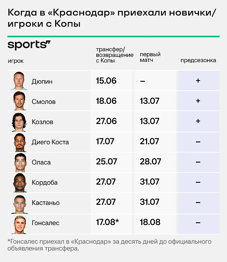 Положение «Краснодара» усугубилось успешной игрой Колумбии и Уругвая на Кубке Америки: левый защитник Лукас Оласа, центральный полузащитник Кевин Кастаньо и нападающий Джон Кордоба задержались на турнире до самого конца (Уругвай играл за третье место, Колумбия – в финале). Финал Копы прошел ровно за неделю до старта РПЛ – и уже даже после Суперкубка России. Оласа, Кастаньо и Кордоба остались без предсезонки.