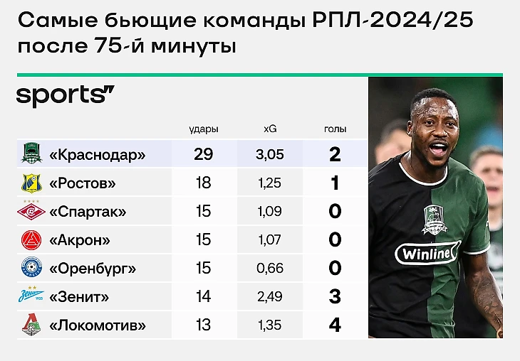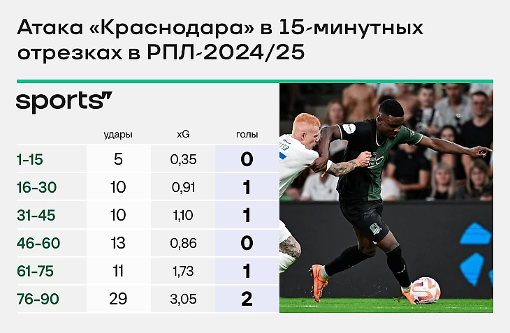 «Краснодар» не лучший в лиге по голам после 75-й минуты (2 гола, у «Локомотива» – 4), но явный лидер по ударам и созданной опасности.