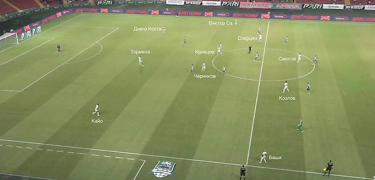 В начале позиционных атак Кайо, Тормена и Диего Коста образовывали тройку в первой линии. При обороне к ним с флангов подсаживались Баши (справа) и Виктор Са (слева).