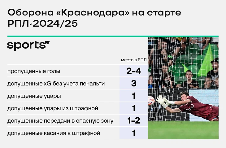 «Краснодар» начал сезон с убийственной обороны против «Зенита»: сначала дважды пропустили после стандартов, а затем допускали быстрые отрывы. В РПЛ все гораздо лучше: всего три пропущенных гола за пять туров и вхождение в число лучших по всем оборонительным показателям.