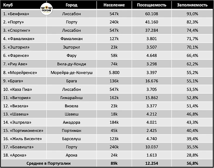 Второй клуб этого материала с очень скудными показателями - «Арока», чуть больше 1500 человек в среднем ходят на матчи высшего дивизиона Португалии