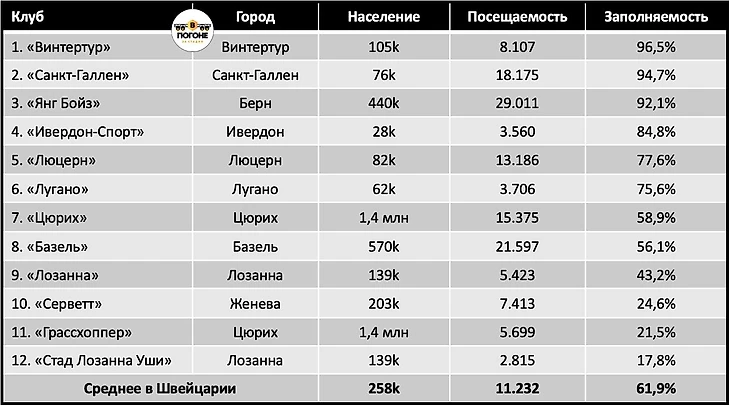 А вот в Швейцарии прям беда с заполняемостью у местных известных клубов: 21,5% - у «Грассхоппер», 56,1% - у «Базеля», 58,9% - у «Цюриха»