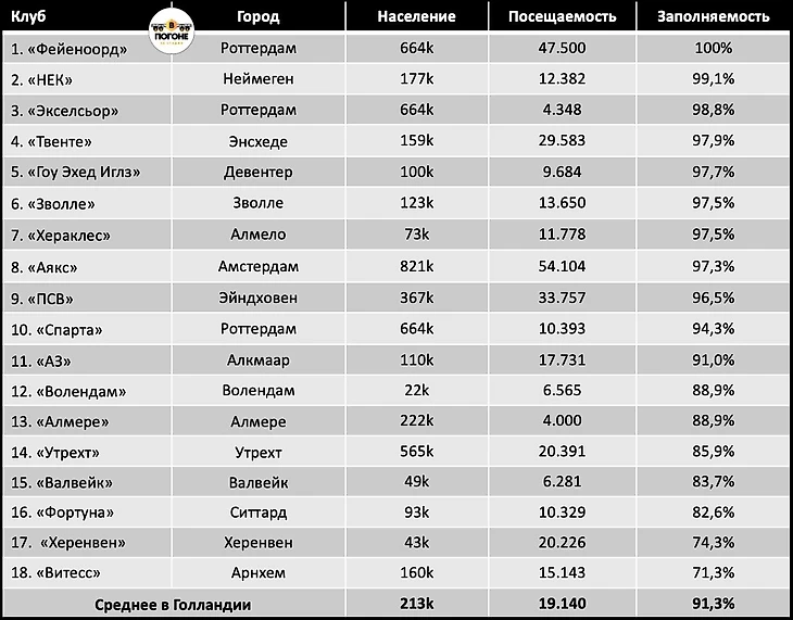 Хотя, безусловно, «Аякс» - самая посещаемая команда страны, просто рейтинг составлен относительно заполняемости