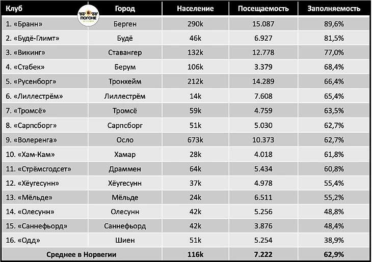 6. Норвежская Элитсерия: заполняемость - 62,9%