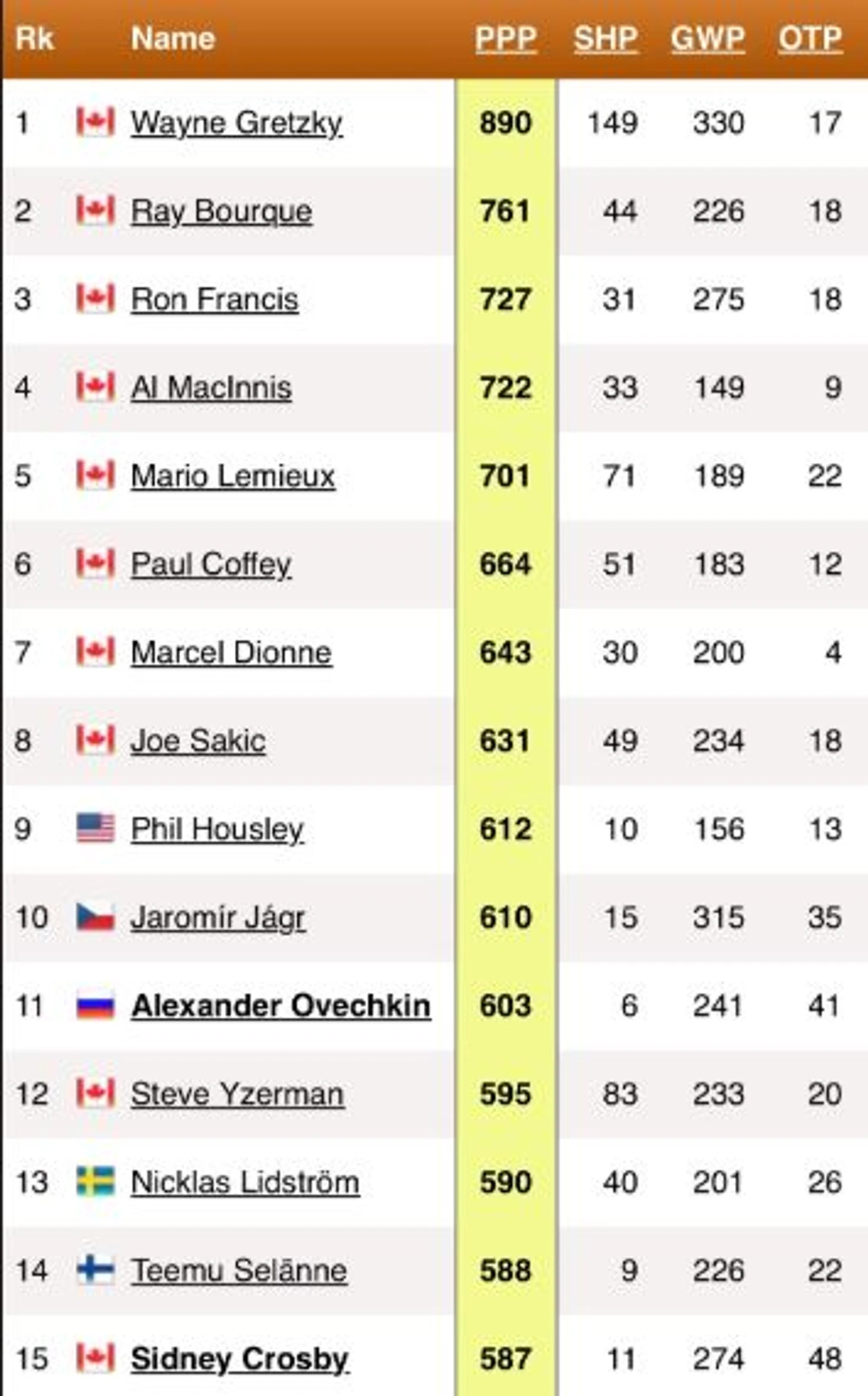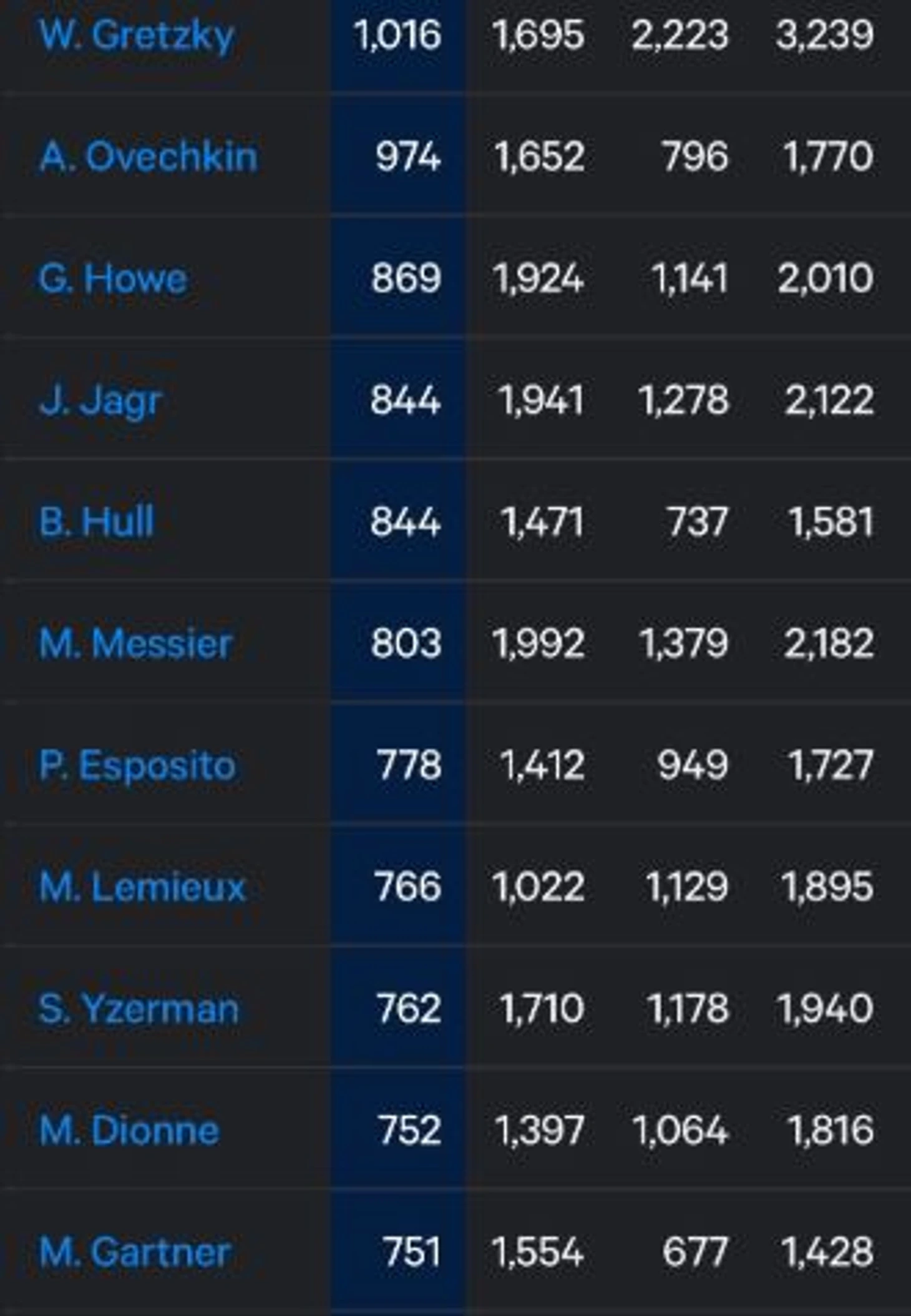 Сейчас Ови занимает 11 место в истории регулярок по набранным очкам (1623). Всего 18 очков отделяют Ови от десятки, которую замыкает Джо Сакик. На 9 месте с отрывом в 64 очка расположился Кросби, еще продолжающий свою великую карьеру. До 8 места Марио Лемье Александру не хватает ровно сотни, что делает данную отметку практически недостижимой.