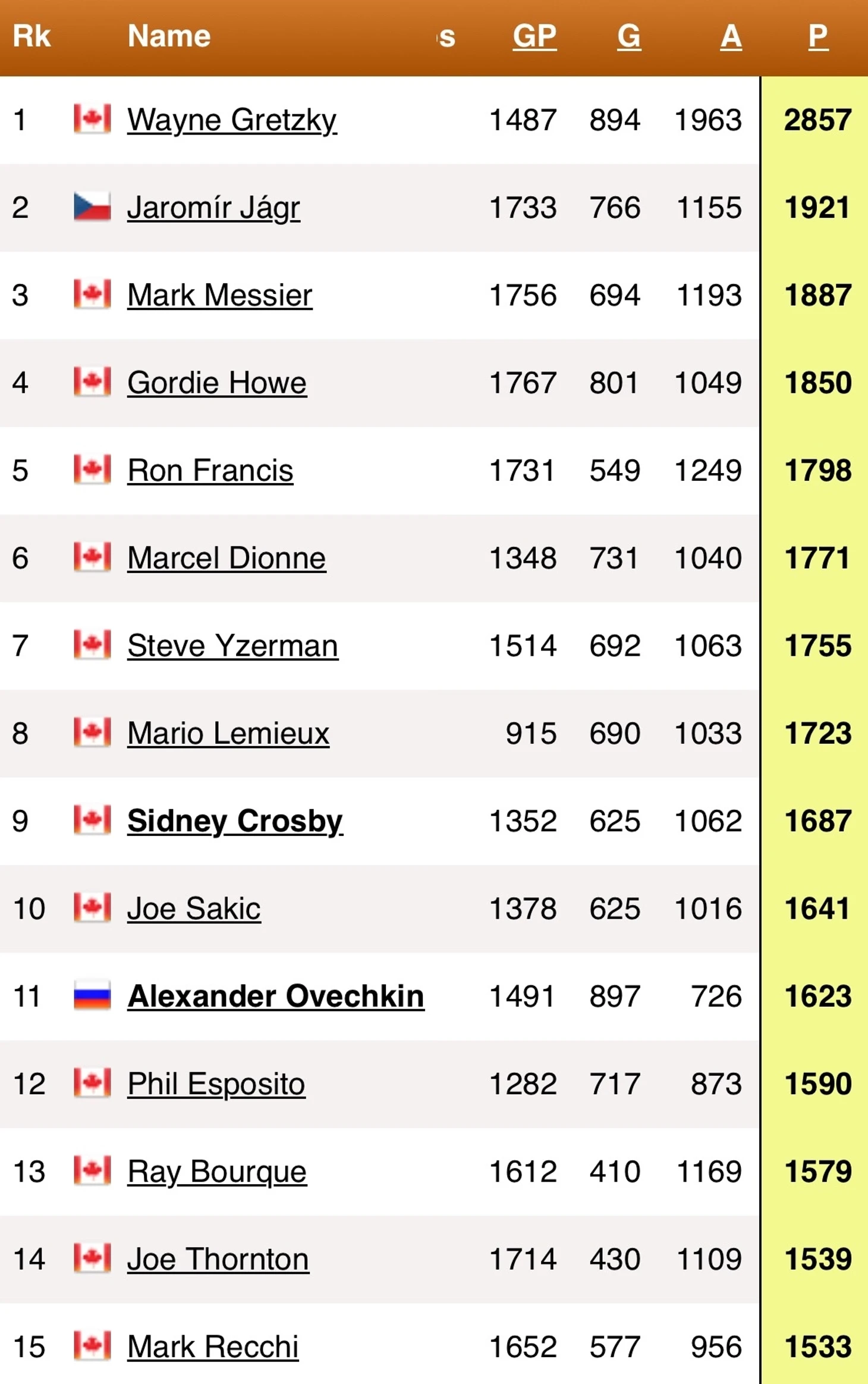 Очередной рекорд, который принадлежит Горди Хоу, набравшего 1809 очков за «Детройт». За ним располагаются Лемье (1723 очка, «Питтсбург»), Гретцки (1669 очков, «Эдмонтон»), Сакик (1641 очко, «Колорадо»). Ови пока что на 5 месте с 1623 очками. Одного сезона точно будет достаточно, чтобы попасть в Топ-3
