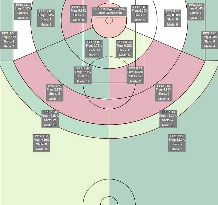 Такая манера игры идет на пользу эффективности атаки баскетболиста: он реализует 38,7 процента трехочковых. Причем все они выполнены после результативных передач партнеров.