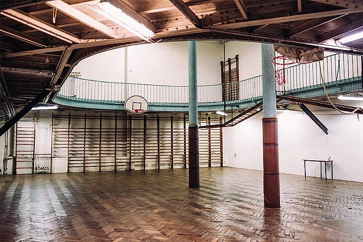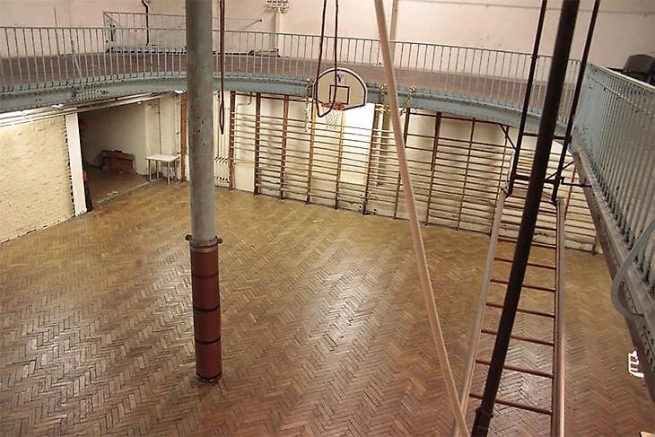 Баскетбольный корт находится в подвале здания. Сейчас в нем чаще проводятся тренировки по боевым искусствам и танцам. Играть с мячом тоже получается, но это не очень комфортно: студенты рассказывают, что во время бега можно запросто споткнуться об торчащие повсюду дощечки старинного деревянного паркета. За последние десятилетия резкой модернизации подверглись только баскетбольные щиты и кольца. Без них сложно представить игру в современном виде.