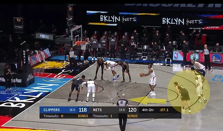 4. В то же время на половине площадки «Клипперс» Батюму пришлось разрываться между Ирвингом и Грином. Кайри совершил небольшой рывок к своим партнерам, вынудив Николя следовать за ним.