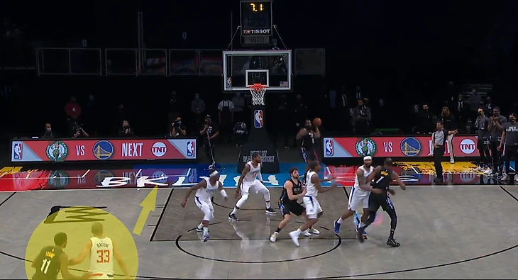 Если Джексон, будучи на дуге во время исполнения штрафного, должен был страховать отрыв на свою половину (стандартное действие), то он должен был передать Харриса Ленарду после того, как у «Бруклина» не получился первый быстрый ввод мяча (Харден забрал его себе).