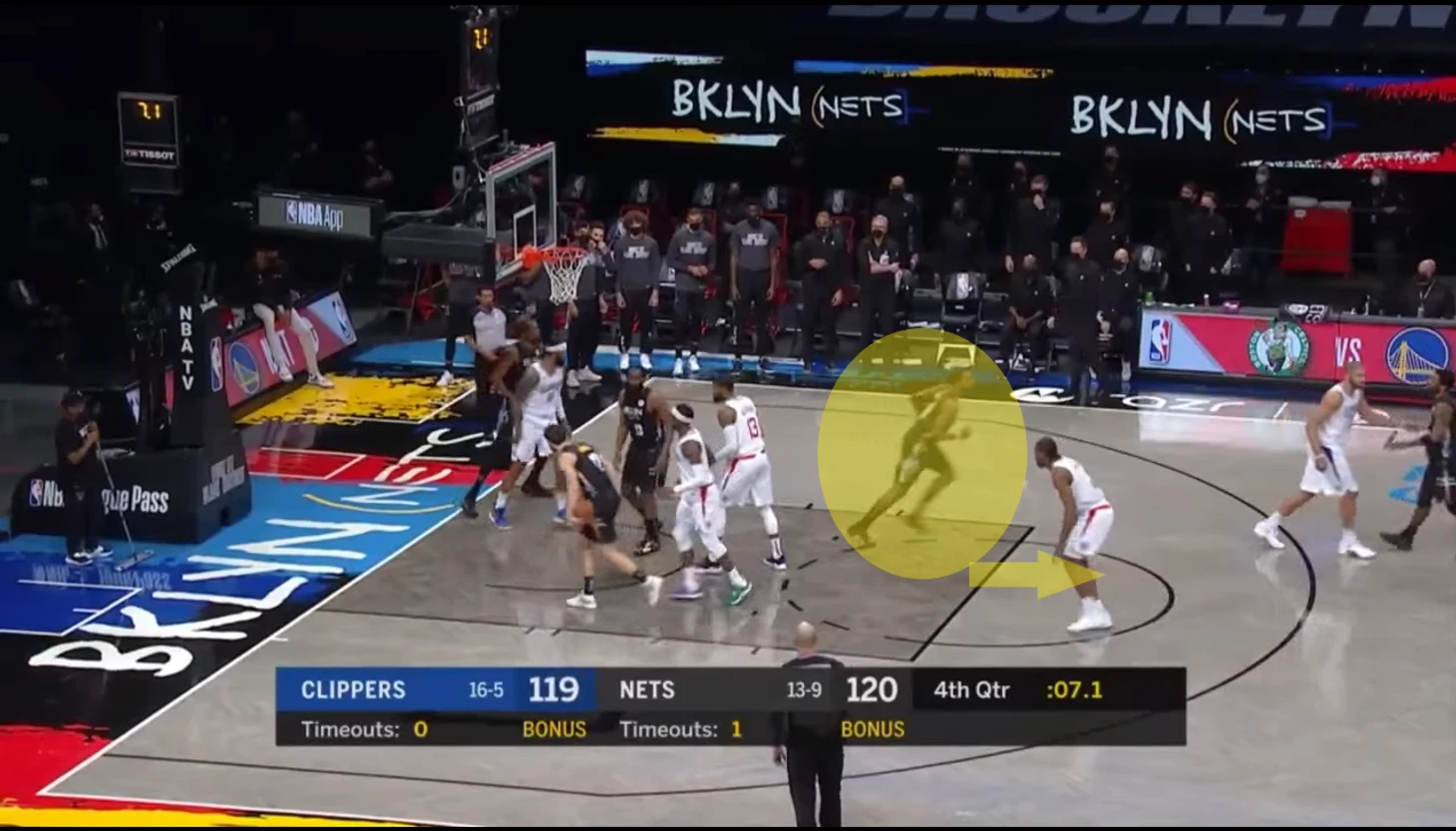 3. В результате четыре игрока ЛАК находились на чужой половине против двух полевых «Бруклина» (Харден забрал мяч у Харриса и выносил его из-за лицевой). Джордж отвернулся от «Бороды» и страховал в поле, Кавай одновременно держал всех и никого.