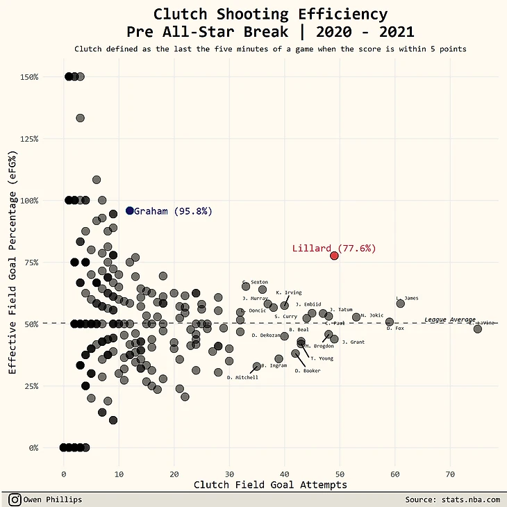 Несмотря на уже легендарный трехочковый, забитый весной 2019 года «в лицо» Полу Джорджу и отправивший отдыхать «Оклахому» после первого раунда, пока что клатчевые успехи Лилларда в основном распространяются на игры регулярного чемпионата. Тем не менее они очень важны как для самого разыгрывающего, так и для «Портленда».