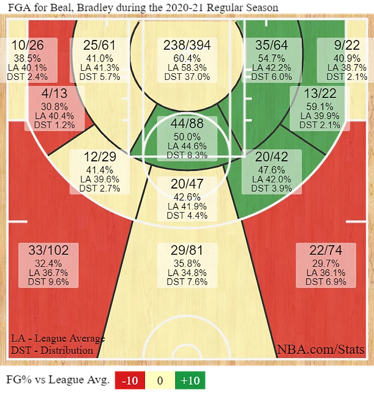 • Количество попаданий в исполнении Била после ассистов и без них одинаково. В отличие от многих других звездных скореров, он гораздо чаще полагается на бросок после передач от партнеров. К примеру, показатель самостоятельно созданных бросков Луки Дончича равен 85,5%, у Била – только 50%.