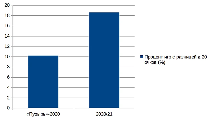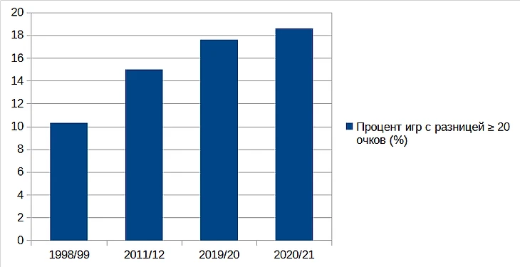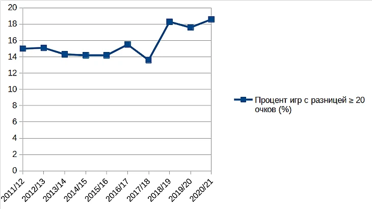 Резкий скачок (с 13,6% до 18,3%) в количестве таких исходов произошел в сезоне-2018/19. Именно по итогам того чемпионата число трехочковых бросков, выполняемых командами в среднем за игру, перевалило за 30.