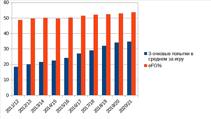 Тем не менее масса дальних попыток росла регулярно и постепенно, так же как и эффективность бросков с игры (eFG% учитывает разницу между 2- и 3-очковыми попытками и корректирует показатель эффективности в соответствии с точностью каждого вида бросков).