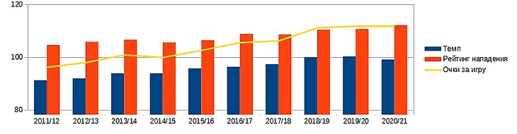В сезоне-2018/19 произошел резкий скачок в темпе (с 97,3 до 100,0) и набираемых очках (с 106,3 до 111,2), что соответствует динамике разгромов. Скорость текущего регулярного чемпионата опустилась до 99,1 владения, но количество очков по-прежнему держится на уровне прошлогоднего показателя (111,8 – самый высокий за 30 лет) за счет высокой эффективности и уровня рейтинга нападения.