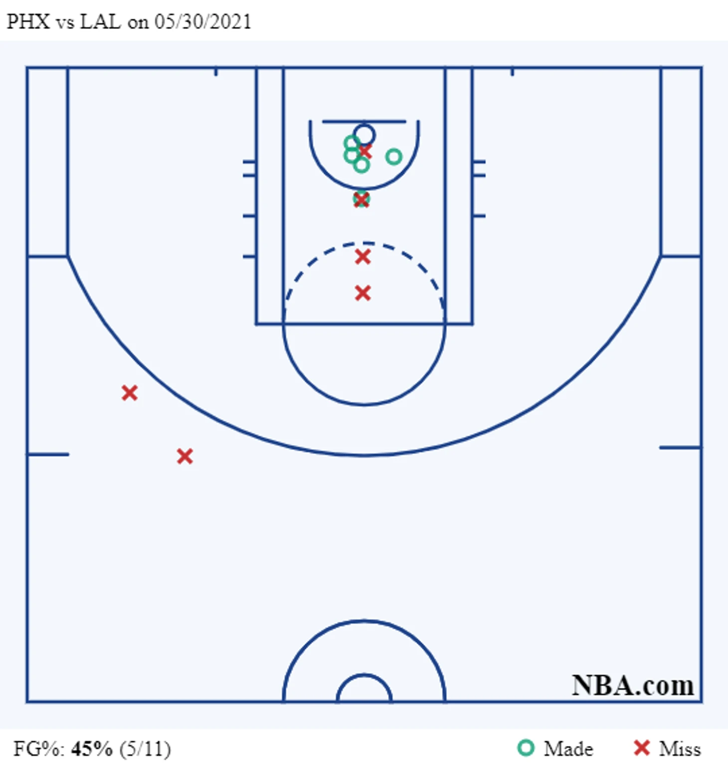 Особое значение в матче вновь обрел Деандре Эйтон. После того как в большом перерыве стало известно, что Дэвис не вернется на паркет из-за травмы паха, центровой аризонского клуба начал хозяйничать в зоне у чужого кольца. Его показатель задействования вырос с минимальных 6,4% за первую половину до 18,4% уже во второй части матча. Во многом это связано с тем, что набравший 15 очков за первые две четверти Девин Букер явно снизил обороты (всего 2 очка за оставшееся время), так что «Финиксу» пришлось искать варианты со всеми игроками на площадке.