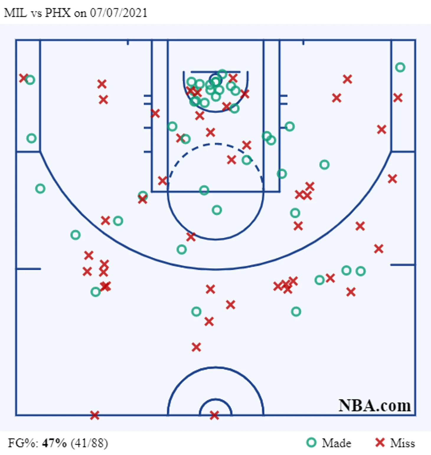 В обороне «Бакс» просто не нашлось зон, из которых они могли позволить совершать открытые броски баскетболистам «Санз». «Финикс» попал только 32,4% трехочковых, но даже когда Девин Букер выбрасывает 1 из 8 из-за дуги, с ним необходимо работать плотно, иначе он накажет. Средние броски – излюбленная тема как Пола, так и Букера. Под кольцом постоянно дежурит Эйтон с 80% реализации в матче. Команда Монти Уильямса атаковала разнообразно и не сбивалась на один-два типа попыток.