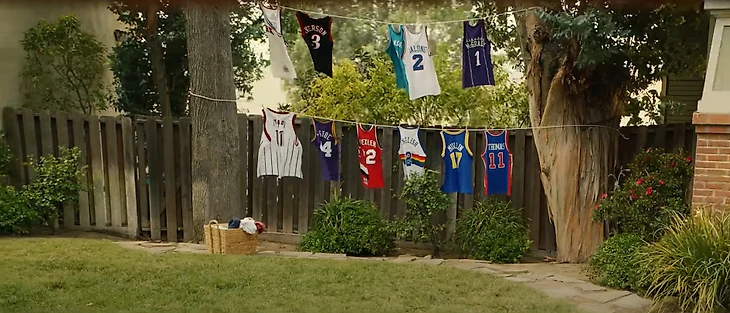 • По пути мы замечаем сохнущую на улице одежду. На веревке для белья развешены игровые майки Айзейи Томаса, Криса Маллина, Алекса Инглиша, Клайда Дрекслера, Пита Маравича, Яо Мина, Трэйси Макгрейди, Мозеса Мэлоуна, Лэрри Джонсона и Аллена Айверсона.