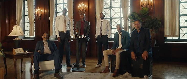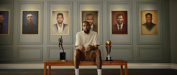 • Кевин Дюрэнт сидит в окружении портретов нескольких обладателей титула MVP: Янниса Адетокумбо, Мозеса Мэлоуна, Тима Данкана, Аллена Айверсона, Уилта Чемберлена. Уиллис Рид остался за кадром (его изображение мы видим несколько раньше).
