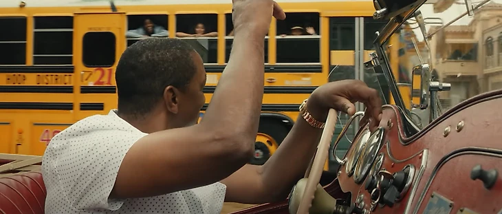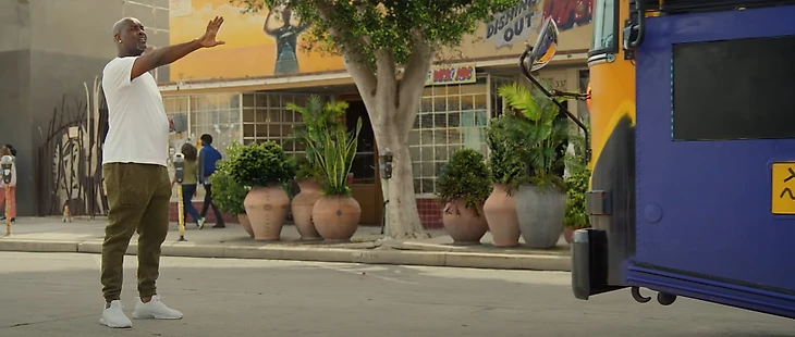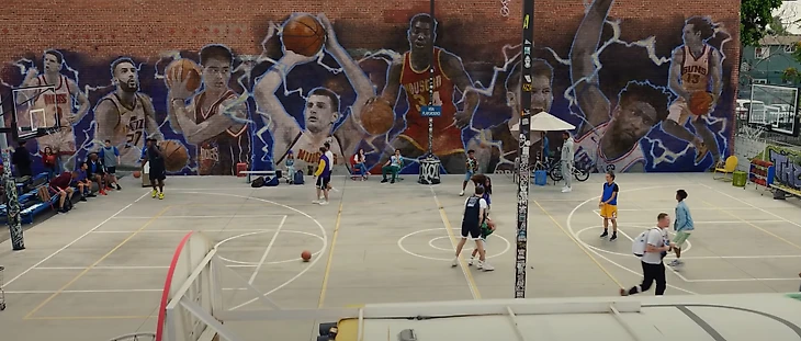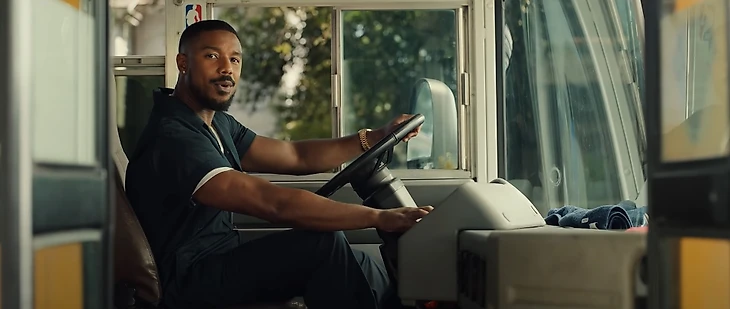 • Затем бросающую мяч девочку подбирает «Автобус баскетбола», за рулем которого находится наш гид по переулку – актер Майкл Би Джордан.