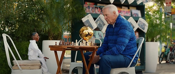 • Чемпион НБА Джерри Уэст (тот самый с лого) играет в шахматы с Lil Penny – немного страшноватой куклой Пенни Хардуэя, которую использовали в старой рекламе Nike.