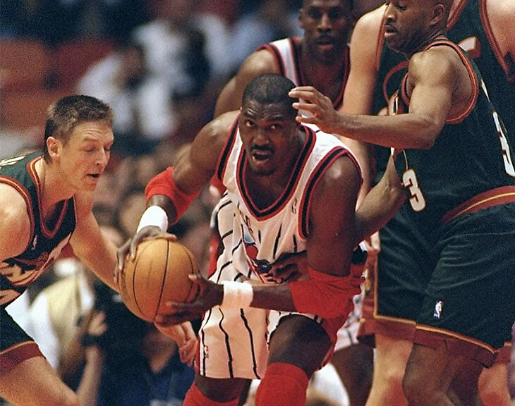 Эти «Рокетс», вероятно, наиболее подходящий аналог современных «Лейкерс». В том аномальном по количеству ветеранских команд сезоне-1997/98 в составе «Хьюстона» оказалась целая россыпь знаковых для прошлых лет игроков: от звезд – Оладжувона, Дрекслера и присоединившегося к ним годом ранее Чарльза Баркли, до мастеров поскромнее – Уиллиса, Эли и Джонсона. Более того, в команде не нашлось никого моложе 24-летнего Отелло Харрингтона!