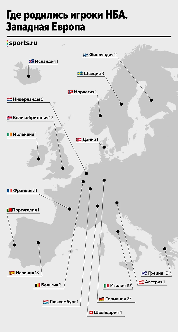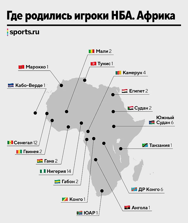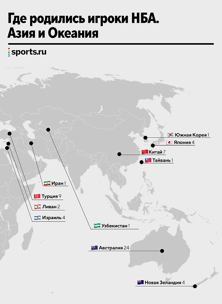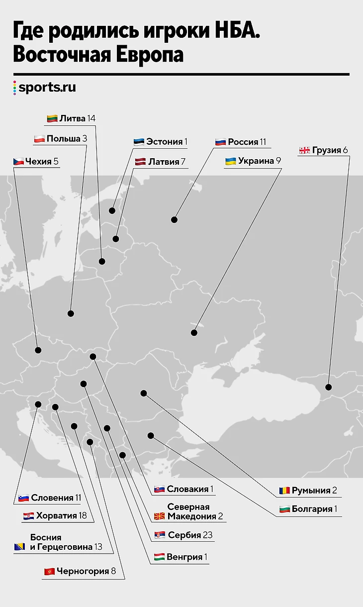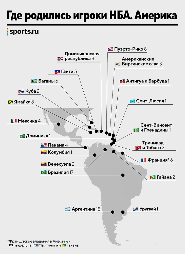 Примечание: Здесь и далее на картах указаны именно страны, где в данный момент расположены места рождения игроков, а не сборные, за которые они выступали. Во-первых, были и есть баскетболисты с двойным гражданством, которые так и не сыграли ни за одну сборную, а были и те, кто менял представительство; во-вторых, проверить паспорта всех игроков в истории НБА не получится. Место рождения – более четкий параметр для инфографики, хотя даже тут могут быть загвоздки и споры: переименования и развалы государств, спорные территории, даже неточности в документах (новичок «Индианы» Крис Дуарте, по разным источникам, родился то ли в Канаде, то ли в Доминикане).