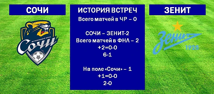 С новыми сочинцами «Зенит» еще не встречался. Можно, правда, вспомнить матч, прошедший в сентябре 2017-го в рамках Кубка России. Тогда команда Александра Точилина, которая еще была питерским «Динамо», сенсационно обыграла зенитовцев со счетом 3:2. А в прошлом сезоне всю силу ФК «Сочи» на себе ощутила вторая команда «Зенита», дважды уступившая сочинцам в рамках Первенства ФНЛ.