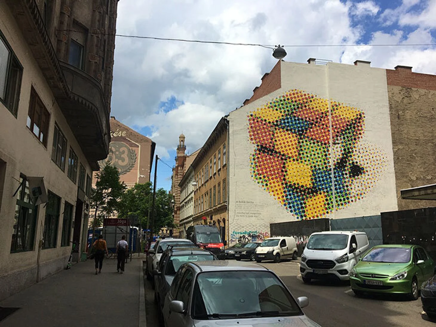 Подробнее о матче века можно прочитать здесь, а за муралом нужно идти в Еврейский квартал (или район VII) Будапешта. Во время войны здесь находилось еврейское гетто, а теперь Большая синагога, кошерные магазины и знаменитые руинные бары. В нескольких шагах от футбольного граффити вы увидите еще одно полотно, посвященное знаковому для Венгрии достижению. Это кубик Рубика, который в 1974 году изобрел венгерский скульптор Эрне Рубик.