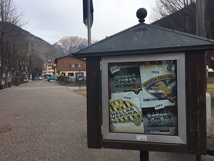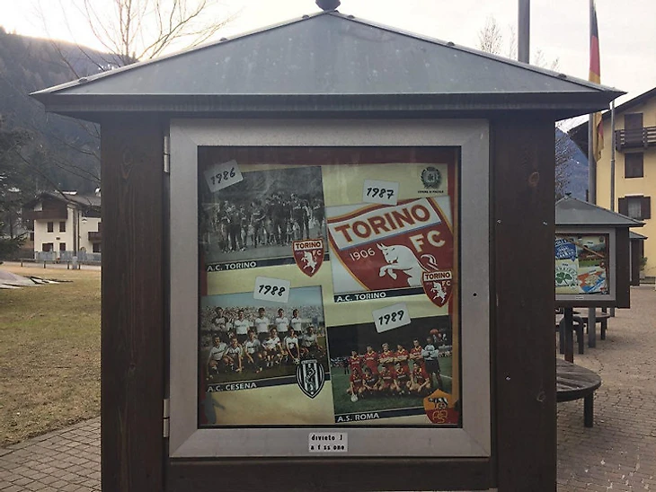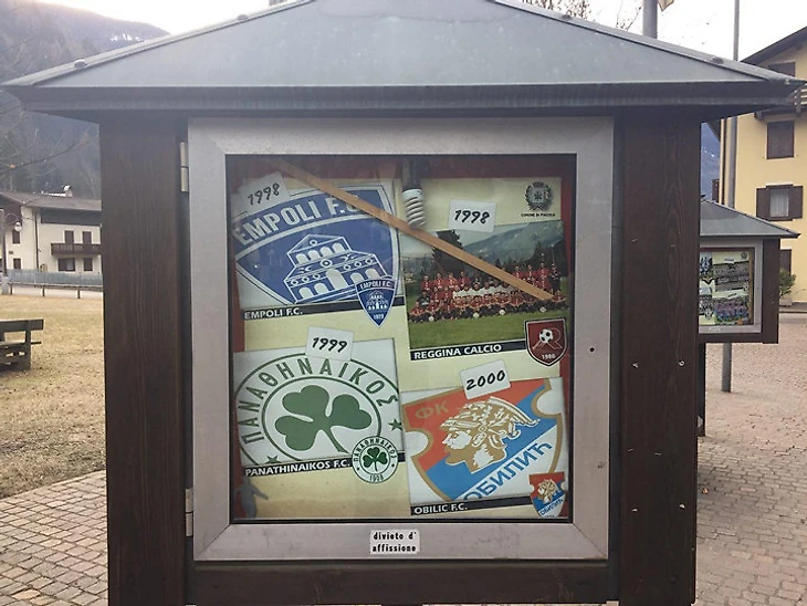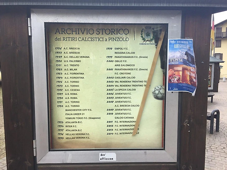 В другой части центра, у слезоточивого монумента с городами, несколько информационных столбов. Все они посвящены футбольным командам, которые приезжали в Пинзоло на сборы. Вот сводная таблица: