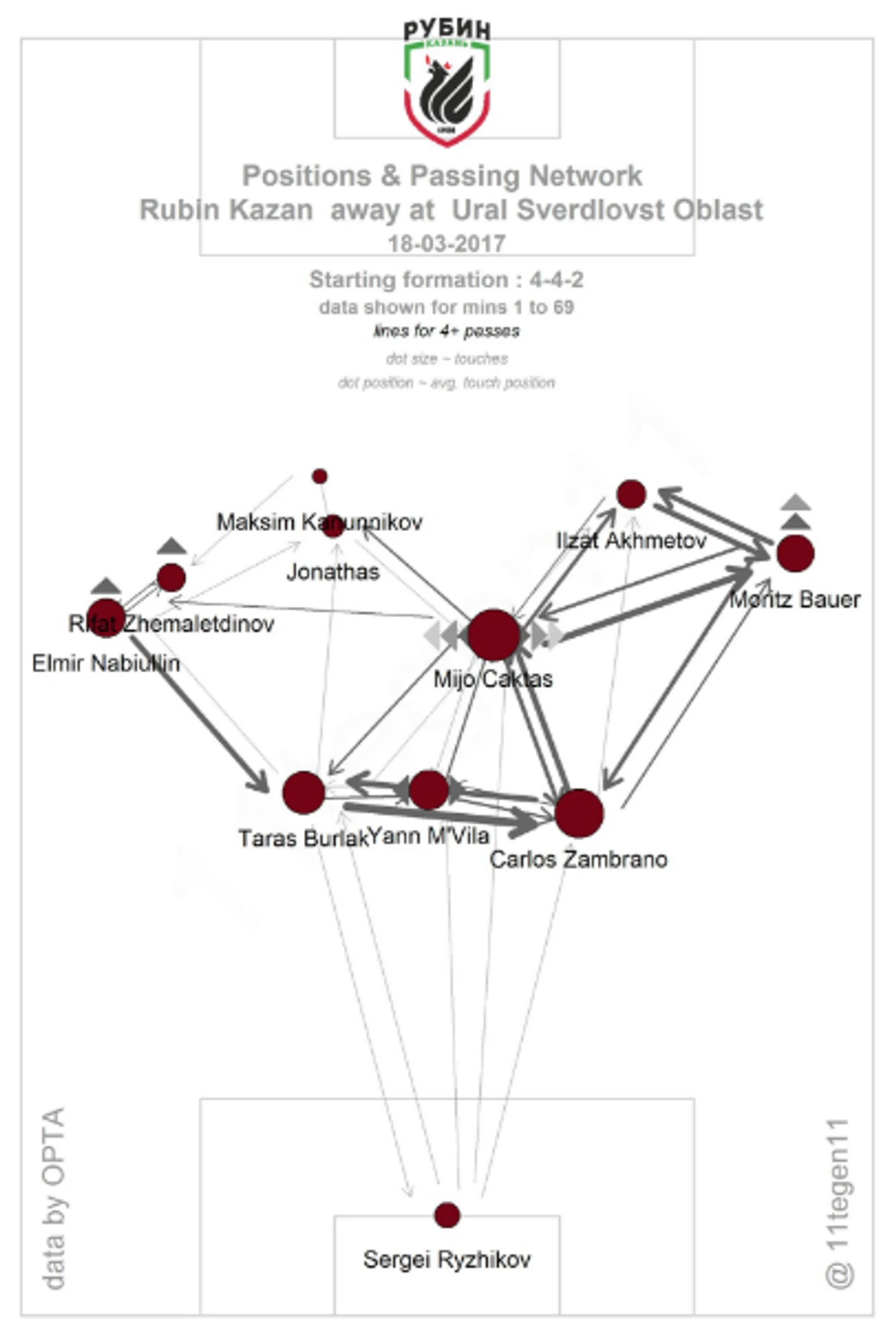 Чем больше кружок у игрока, тем больше у него касаний мяча; чем жирнее стрелка между игроками, тем чаще они пасовали друг другу. Если переводить схему на человеческий язык, то футбол «Рубина» против «Урала» – это перекаты мяча поперек поля без продвижения к чужой штрафной. Мвила зачем-то (очевидно – по тренерской установке) опускается к центральным защитникам – и неважно, что против тебя команда, которая почти не прессингует. «Рубин» теряет лишнего игрока в центре поля, а все русские игроки атаки очень слабо двигаются – отдать передачу для хоть какой-нибудь атаки можно только на Бауэра, он хоть что-то делает впереди. Если еще проще: «Рубин» совершенно не понимает, что делать с мячом.