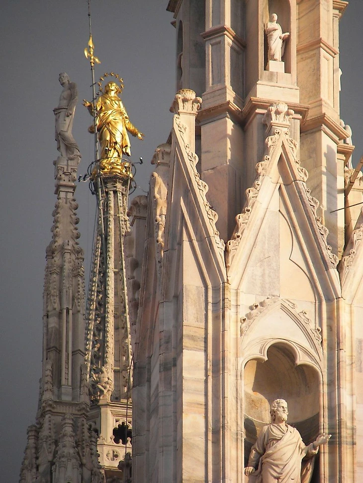 Собор выполнен в готическом стиле из белого мрамора и поражает красотой внешнего оформления. Фасад украшен башенками, статуями святых, композициями, изображающими библейские истории, фигурами диковинных существ. Над всем этим возвышается фигура Мадонны – именно она считается покровительницей города.