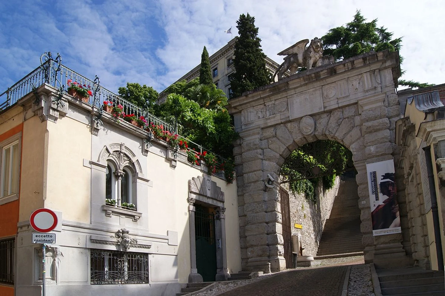 Вход в замок Удине осуществляется с Пьяцца Либерта через арку Боллани, увенчанную вышеупомянутым венецианским львом.