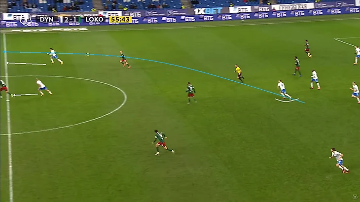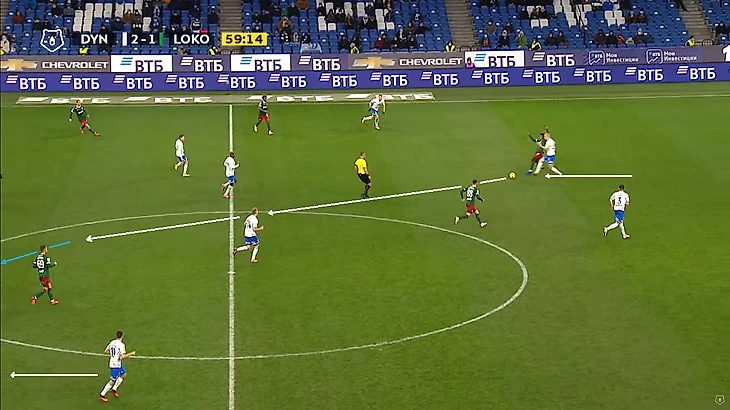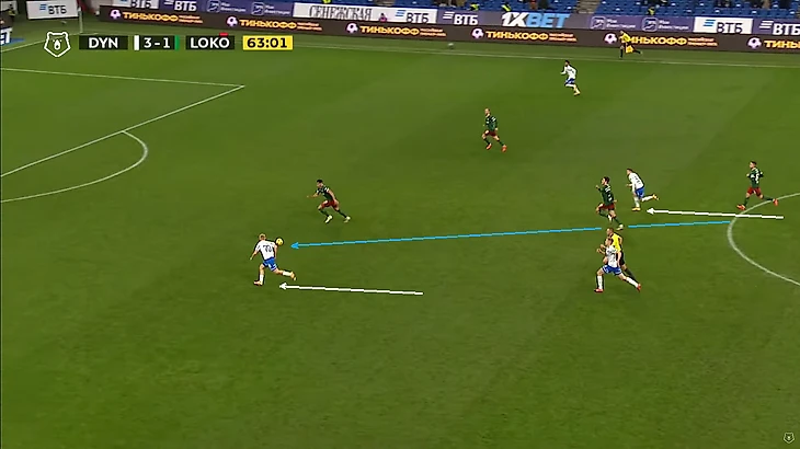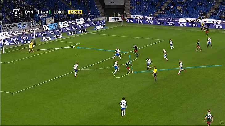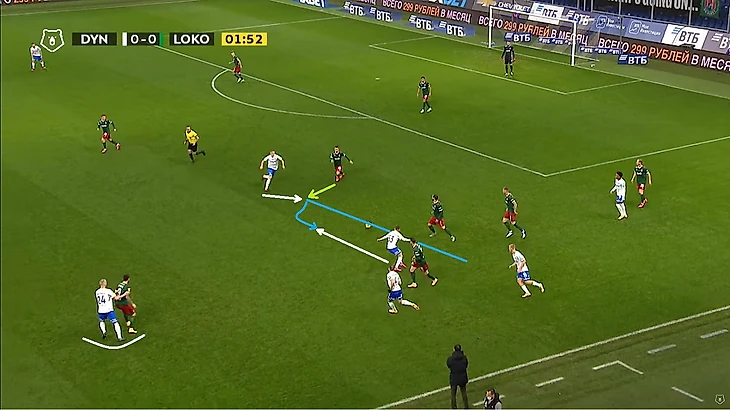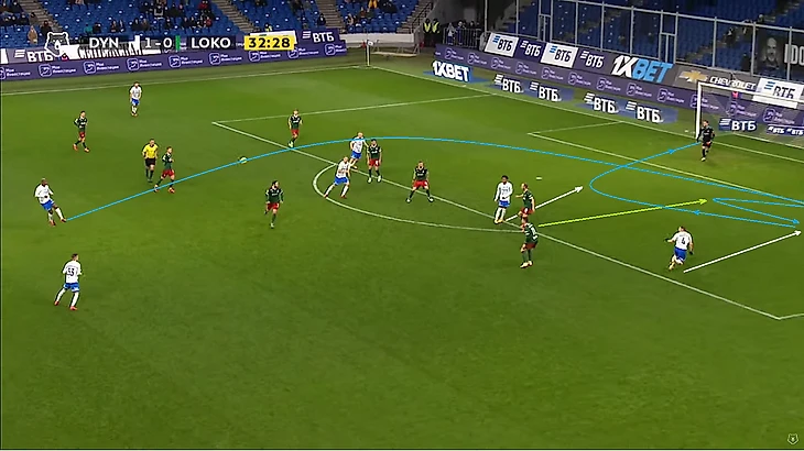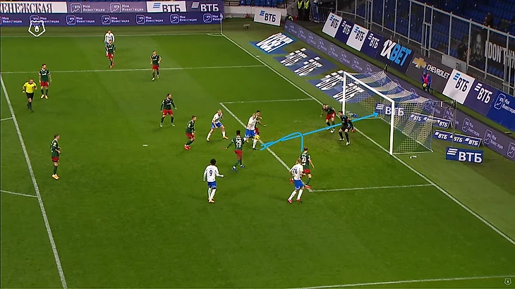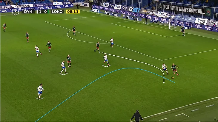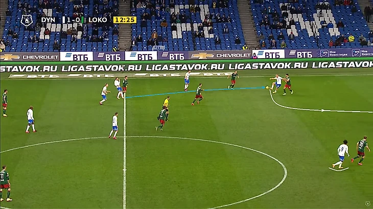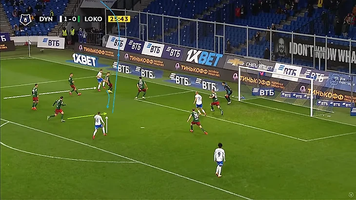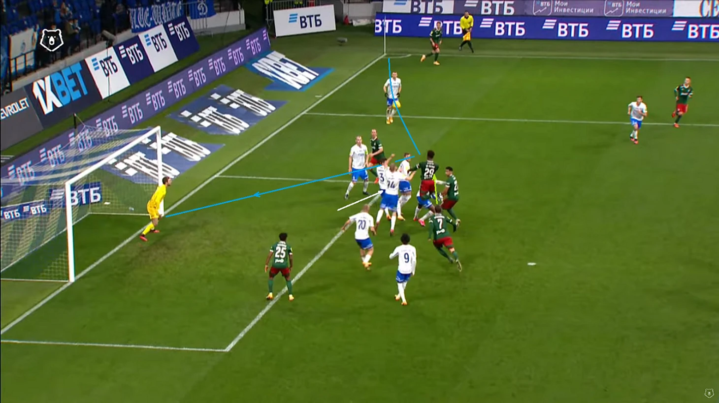 Голевая же атака началась с привычного прессинга Динамо на половине Локомотива: вялый пас от Миранчука, Фомин опережает Куликова, Шиманьский отыгрывает налево, проход по центру, Дмитрий Живоглядов переводит мяч на угловой после прострела Н'жи, и после чего следует голевой угловой.