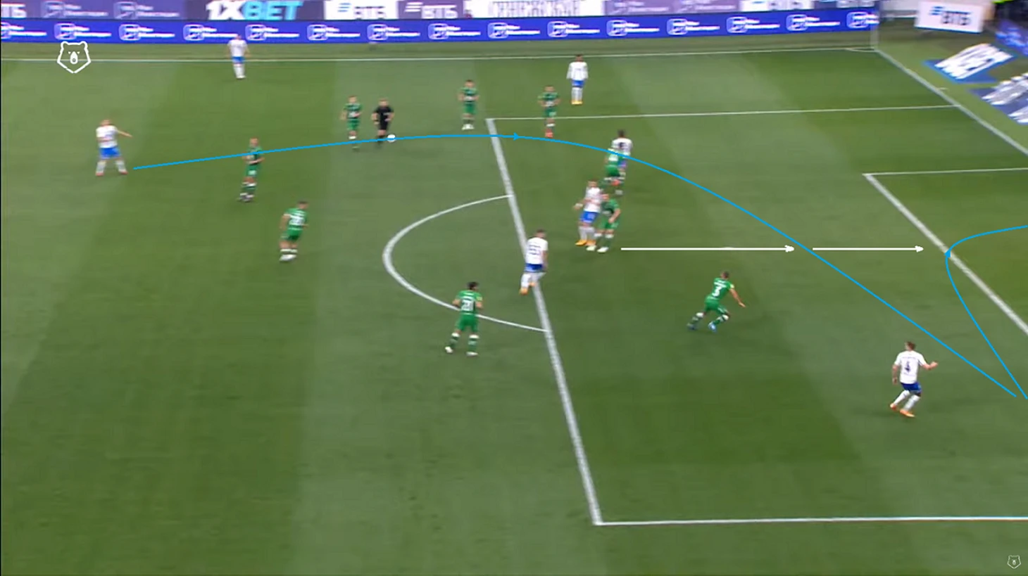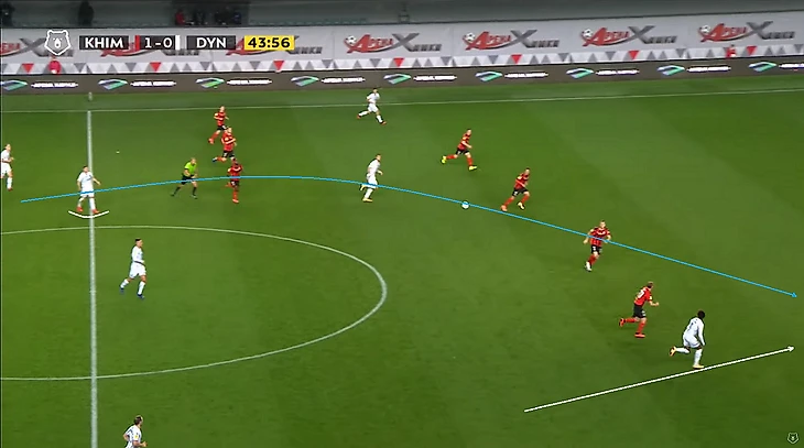 Весь первый тайм Динамо атаковало преимущественно через правый фланг, где резвился вернувшийся после травмы и соскучившийся по футболу Клинтон Н'жи. В тоже время на левом фланге практически безуспешно действовал, или я даже скажу – притаился Даниил Лесовой. При этом стоит отметить его прессинг в начале 9 минуте на правом фланге вместе с Н'жи, приведший к потере мяча команды из Черкизова.