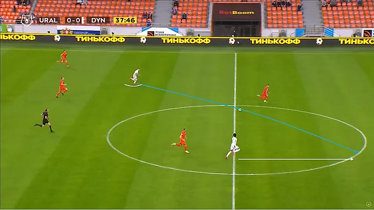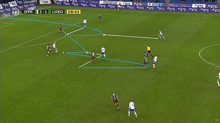 Спустя две минуты Динамо разыграло комбинацию, которая, на мой взгляд, является одной из визитных карточек команды в этом сезоне, пусть и получается не часто: розыгрыш мяча в одно касание между 4-5 игроками: