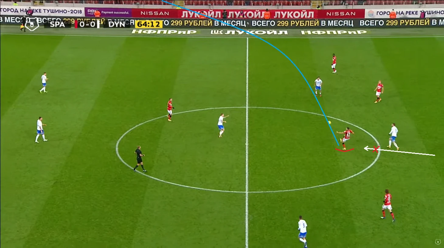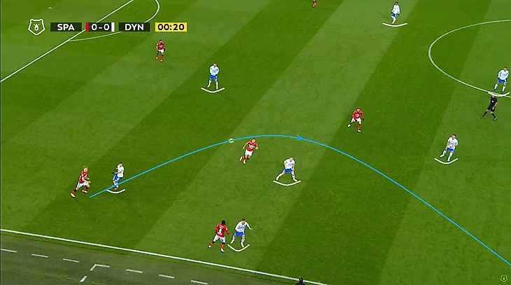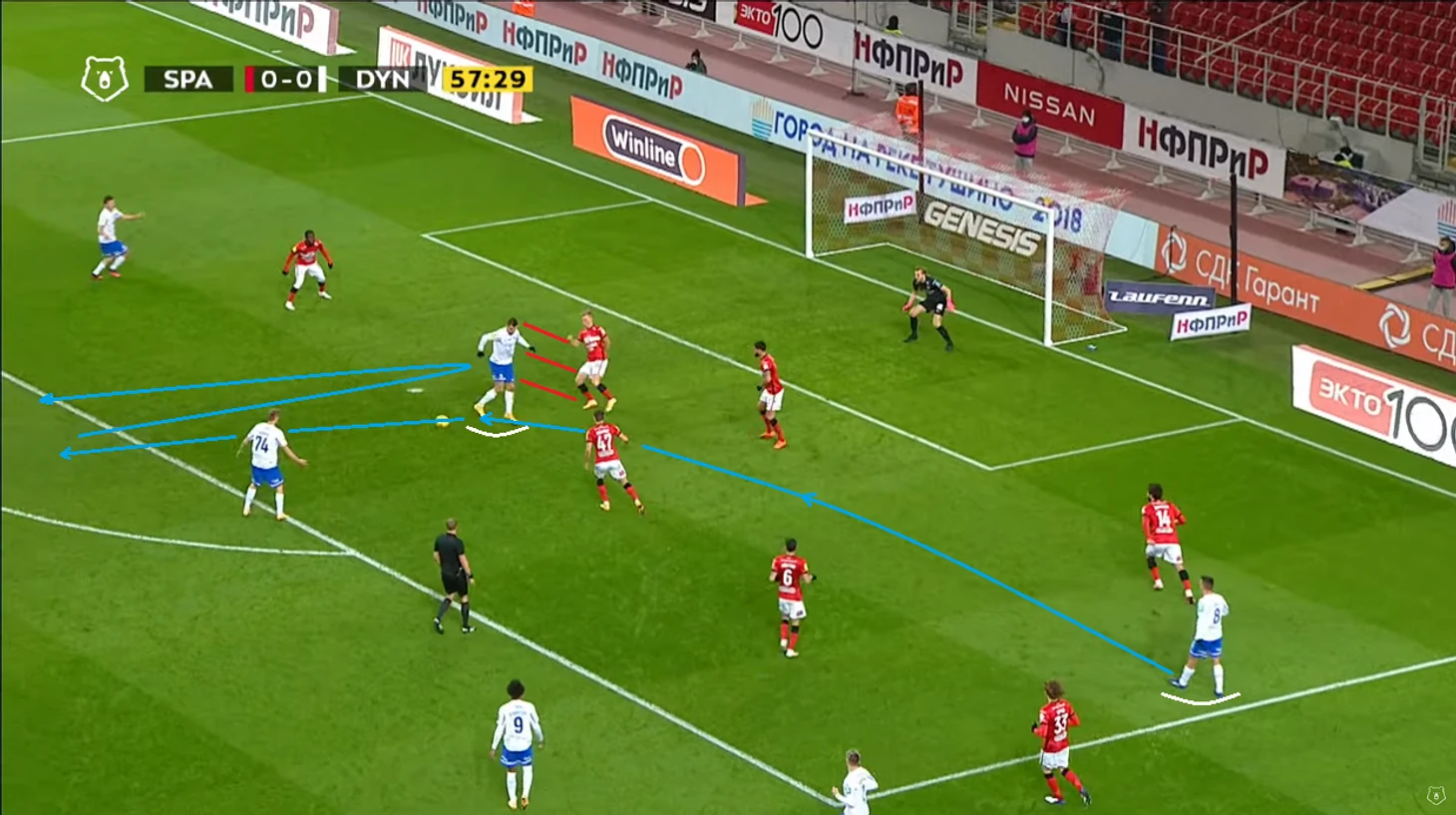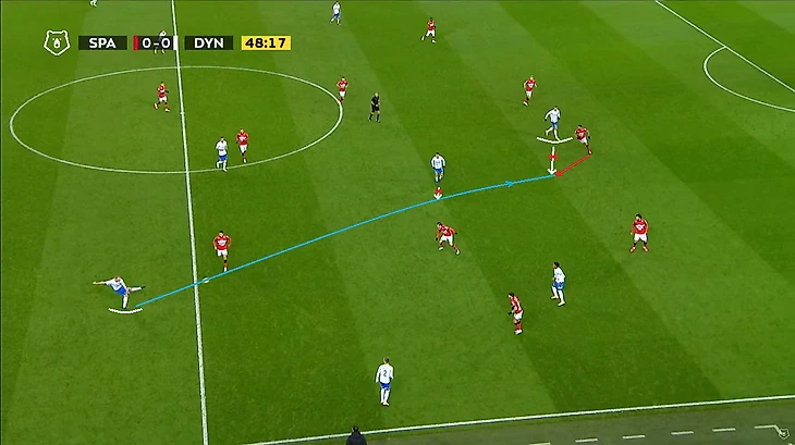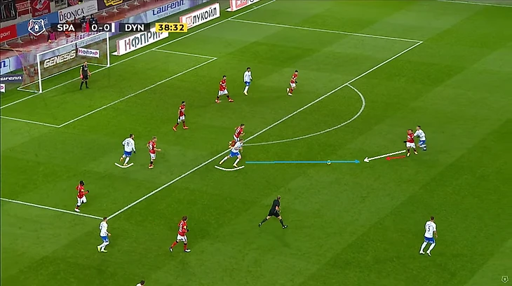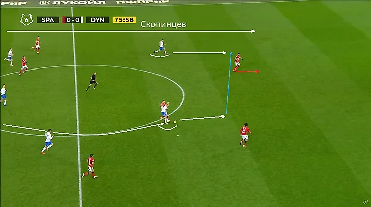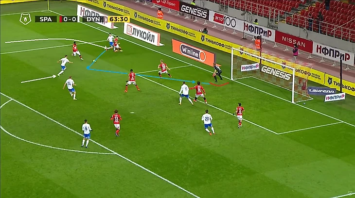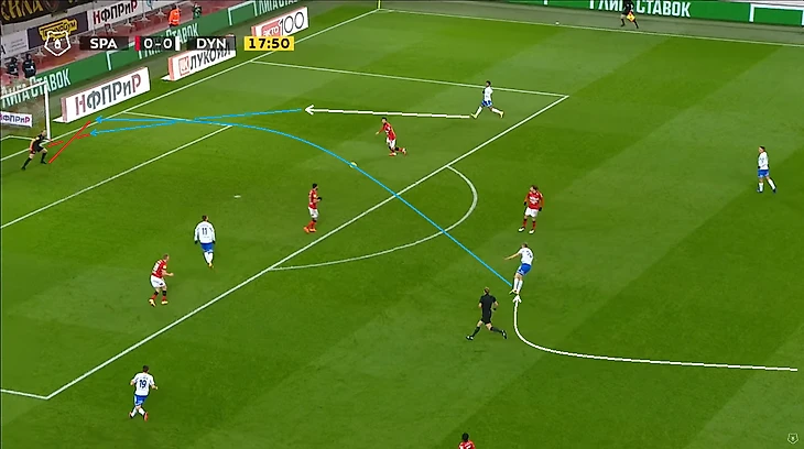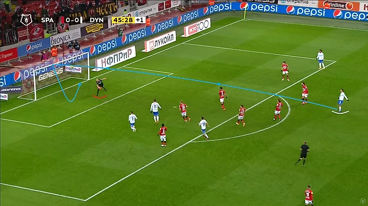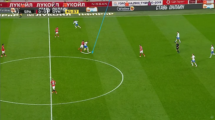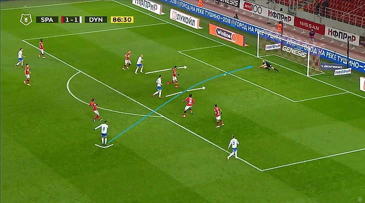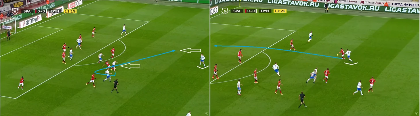 Помимо высокой игры динамовцев следует отметить равномерность атак. Если в прошлом туре в первом тайме темп задавал в основном Н’жи, то в этом тайме были активны оба фланга, правда игра Лесового часто прерывалась безнаказанными нарушениями со стороны оппонентов. На 12 минуте проявился контрпрессинг (прессинг атакующей команды после потери мяча) во всей его красе: перевод Моро справа налево на Лесового, прерванный прострел в штрафную, но мяч у соперника выгрызает в подкате (!) у чужого полукруга (!) Фомин, подбор Нойштедтера. Казалось бы, после неудачной обработки мяча он достался противнику, но Моро уже накрывает опустившегося игрока атаки также недалеко от чужого полукруга (!), пас назад и вынос вратаря точно на никого, а дебютировавший сегодня в старте Гильермо Варела выигрывает дуэль у знакомого нам Александра Кокорина.