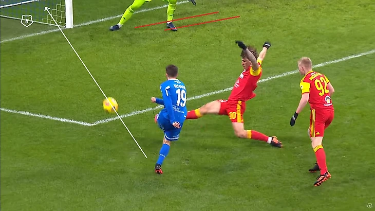 В качестве подтверждения мои слов эпизод минутой позже: нарушение туляков на нашей половине, Лесовой быстро разыгрывает мяч, но Фомин и Шиманьски просто дарят его сопернику. Внимание Антона Терехова также было не на мяче: