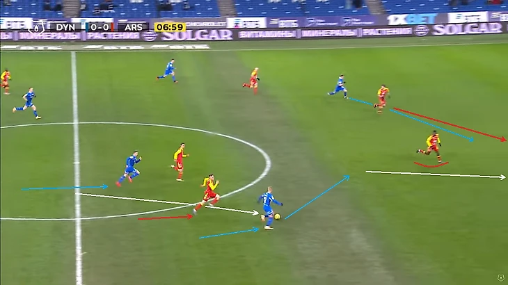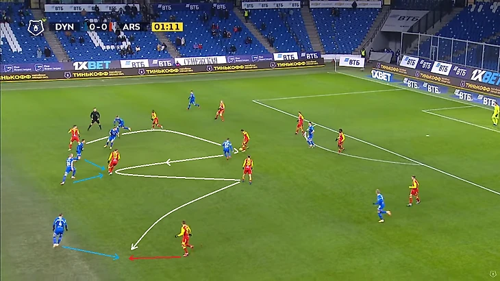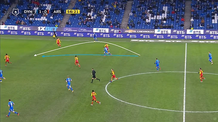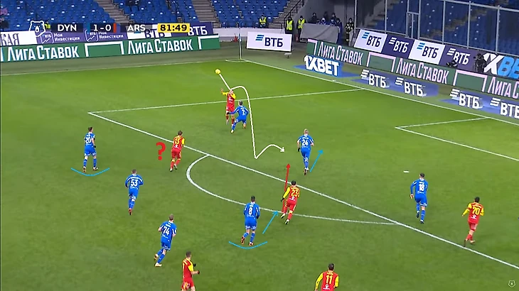 Первые 25 минут второго тайма были явно за Динамо, которое становилось похоже на то «самое Динамо», которое строит Сандро Шварц: агрессивное по всему полю и на протяжении всего матча. Но Шварцу ещё предстоит много поработать для того, чтобы стабильность команды была в каждом без исключения матче. Этой же игре предстояло снова сменить свой вектор. Либо это жёлтая карточка Ордецу повлияла, либо одновременная замена в составе Арсенала, но со 72 минуты игра стала равной. А позже, когда наш тренер допускает серьёзную (на мой взгляд) ошибку при расстановке игроков после замены Нжи на Лесового, Арсенал вообще перехватил инициативу. Мало того, что вышедший Рауш проводил первую игру в защите справа (по данным transfermarkt.com их было ноль) [мой косяк, нормально Рауш вышел], но и «левый» Грулёв играл справа, а «правый» Нжи играл слева. За десять минут до конца стала напрашиваться замена Моро на Каборе. Посмотрите, как Никола теряет своего игрока на важнейшем участке поля у своих ворот:
