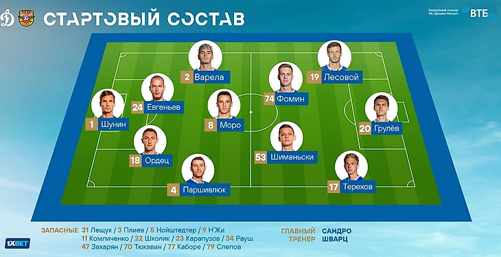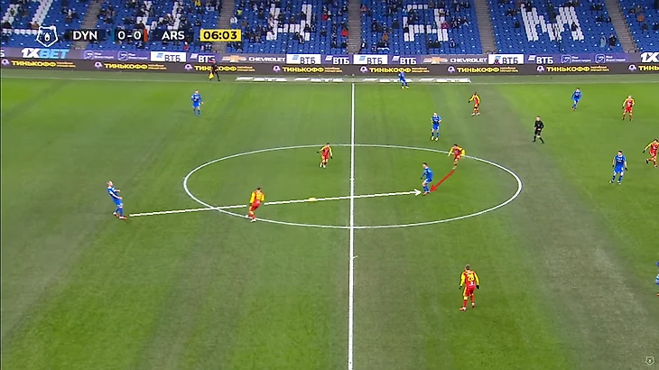 Но вместо Моро Шварц меняет Фомина на Нойштедтера, и выпускает Комличенко вместо Грулёва. Если первая замена ещё понятна, то вторая вызывает вопросы: зачем под давлением Арсенала переводить быстрого выраженного центрального нападающего, выпуская небыстрого игрока на его позицию? Посмотрите, как Костя Тюкавин теряет своего игрока: